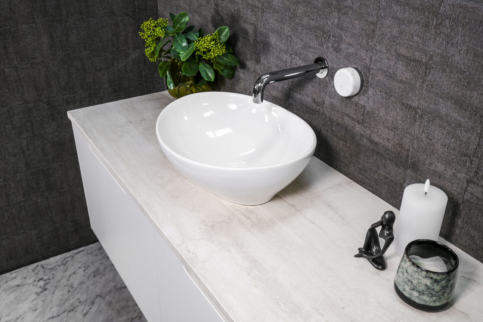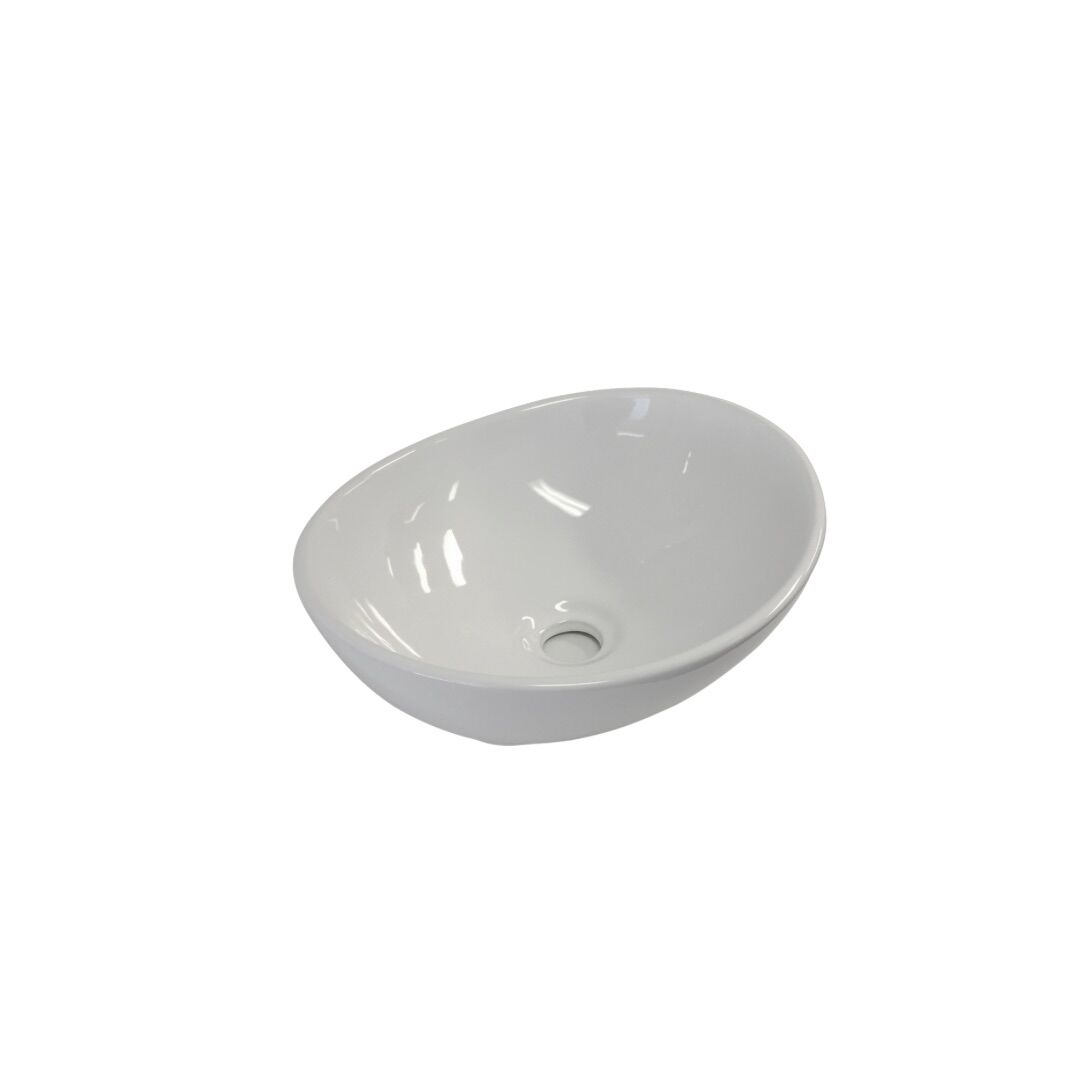 A compact yet stylish oval ceramic basin in gloss white, adding a touch of modern elegance to any bathroom space.